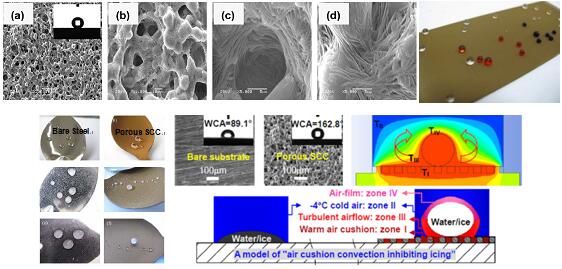 近五年來(lái),表面功能材料及工程研發(fā)中心研究人員在工程性自清潔防結(jié)冰涂層方面取得了系列進(jìn)展。受自然界荷葉表面“自清潔”特性的啟發(fā),該研究團(tuán)隊(duì)利用傳統(tǒng)涂層固化工藝(一步法)可控構(gòu)筑出多種有序聚合物納米纖維織構(gòu)化自清潔涂層(ZL201310568070.2),并揭示了宏觀外力和微觀內(nèi)力干擾高分子結(jié)晶過(guò)程獲得有序聚合物納米纖維的機(jī)理(Nanoscale research letters, 2014, 9(1): 1-10)。由于防冰凍工程應(yīng)用必須面臨苛刻的自然環(huán)境條件,研究人員系統(tǒng)揭示了高低溫交變、太陽(yáng)光照射、酸雨、冰雪覆蓋等對(duì)超疏水涂層長(zhǎng)期有效性的影響(Journal of Polymer Research, 2014, 21(5): 1-9)。針對(duì)目前國(guó)內(nèi)外模擬結(jié)冰測(cè)試手段匱乏、與實(shí)際凍雨結(jié)冰環(huán)境差異較大的問(wèn)題,該研究團(tuán)隊(duì)創(chuàng)新性地研制了“多因素凍雨結(jié)冰模擬測(cè)試系統(tǒng)”,并建立起“多因素凍雨環(huán)境”、“結(jié)冰行為動(dòng)態(tài)跟蹤”及“覆冰粘附力在線監(jiān)測(cè)”動(dòng)態(tài)在線協(xié)同測(cè)試方法(Mechanics in Engineering, 2015, 37(3): 367-371; China Surface Engineering, 2016, 29(4): 10-22)。此外,在工程應(yīng)用示范方面,自清潔涂層改性鋼管(模擬輸電導(dǎo)線)在“模擬凍雨”環(huán)境下掛冰率減小約60%以上;超疏水涂層改性鋼板(模擬測(cè)速雷達(dá)天線罩)在高鐵動(dòng)車(chē)試車(chē)考核下,其冰瘤/冰塊易整體脫附,顯示出良好的工程防冰/除冰應(yīng)用前景。