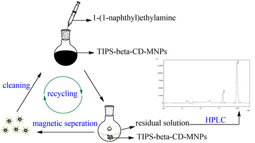 中國科學院成都生物研究所李幫經研究員與四川大學高分子研究所的張晟教授長期致力于基于環(huán)糊精主客體識別的功能性材料研究。基于環(huán)糊精主客體識別的理論,通過共價鍵將環(huán)糊精衍生物(6-TIPS-β-CD)修飾在磁性納米粒子(MNPs)表面,制備了一種新型的具有磁響應性的手性分離材料(TIPS-β-CD-MNPs);實驗研究表明,通過TIPS-β-CD與萘乙胺之間的主客體包合作用,該分離材料表現出高效的手性分離能力,得到的單一構型的化合物的ee值可達到68%;同時該材料中具有較高比例的磁性納米粒子,進而賦予了材料快速的磁響應性能,材料在外界磁場的作用下可以在10秒內與分離液發(fā)生分離;另外,該材料還可多次循環(huán)使用,使用3次后其分離效果仍然能保持到原來的70%以上;我們構筑的這種快速高效的具有磁響應性的手性分離材料具有很好的單一對映體選擇性,可以廣泛的應用于生物醫(yī)藥領域,并為新型的手性分離材料的研究提供新思路。