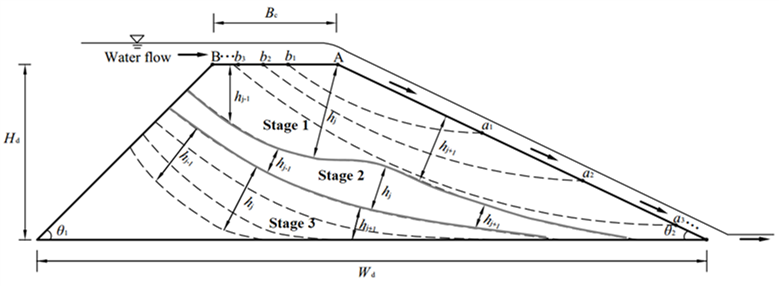 圖1. 堰塞壩沿流動(dòng)方向的漫頂潰決模型