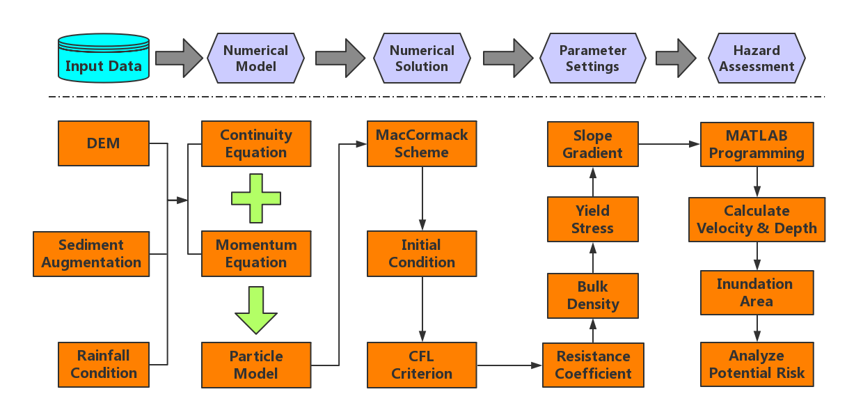 研究團隊結合實地考察與遙感解譯技術,在九寨溝流域內(nèi)發(fā)現(xiàn)83處地震誘發(fā)的崩滑體,主要集中在距震源斷層3 km的范圍內(nèi)。調(diào)查發(fā)現(xiàn)流域內(nèi)扎如溝、荷葉溝、樹正溝、則查洼溝、以及下季節(jié)海子溝泥沙增量較大,震后發(fā)生泥石流的可能性最高。后期通過多期高清遙感影像和無人機相片,解譯獲取地震前后五條泥石流溝的泥沙增量。由此,結合泥沙增量、流團模型、以及數(shù)值模擬手段開發(fā)一套完善的泥石流災害評估方法,并通過震后下季節(jié)海子溝泥石流事件驗證了方法的可行性。利用新方法,評估了上述五條泥石流溝的規(guī)模、沖出距離、堆積范圍、堆積深度等泥石流關鍵特征參數(shù),并制作泥石流危險分區(qū)圖,為震后九寨溝景區(qū)土地利用規(guī)劃、泥石流次生災害防治等提供參考依據(jù)。