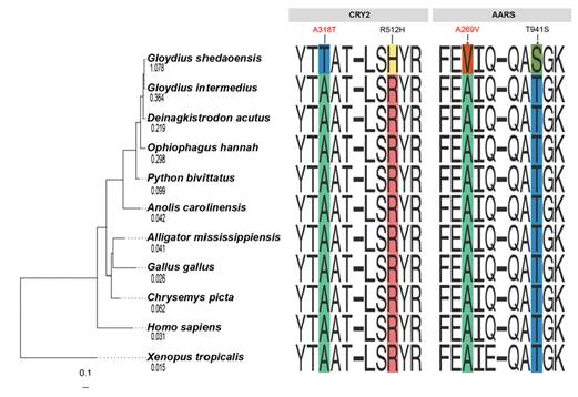 為了研究蛇島蝮潛在的遺傳適應(yīng)機(jī)制,中科院成都生物所生態(tài)領(lǐng)域傅金鐘團(tuán)隊(duì)呂彬,齊銀等科研人員與蛇島保護(hù)區(qū)合作對(duì)蛇島蝮及其大陸近親(G. intermedius)進(jìn)行了轉(zhuǎn)錄組測(cè)序和進(jìn)化比較。結(jié)果發(fā)現(xiàn)蛇島蝮的進(jìn)化速率比大陸近親低得多(只有其69%),這可能與長(zhǎng)期休眠造成的代謝抑制有關(guān)。研究團(tuán)隊(duì)在兩個(gè)基因中檢測(cè)到了自然選擇的信號(hào),包括抗凝血酶(SERPINC1)和肌肉萎縮(AARS)相關(guān)的基因。這些基因可能在抗血栓和維持肌肉功能等方面發(fā)揮了重要作用。節(jié)律性的生理或行為事件可能與環(huán)境振蕩的周期相匹配。生物鐘基因(CRY2)在蛇島蝮中發(fā)生了快速的進(jìn)化,并表現(xiàn)出兩個(gè)僅限于蛇島蝮的氨基酸替換,其中一個(gè)突變可能影響蛋白質(zhì)功能,這與2019年Science發(fā)先的馴鹿適應(yīng)極晝極夜生活的分子鐘基因突變(PER2-CRY complex)不謀而合。另外脂肪酸-β-氧化相關(guān)基因(ACATA1)和晝夜節(jié)律基因(KLF10)表現(xiàn)出趨同/平行進(jìn)化的模式,相較與葡萄糖,脂肪酸氧化可以提供更多的能量。綜上所述,本研究揭示了蛇島蝮在食物匱乏的情形下是如何適應(yīng)長(zhǎng)期靜止及休眠的生活狀態(tài),并在抗血栓形成,調(diào)節(jié)晝夜節(jié)律時(shí)鐘和緩解肌肉萎縮等方面提供了后續(xù)研究思路。在李家堂團(tuán)隊(duì)的幫助下蛇島蝮及其近親的基因組測(cè)序和組裝工作目前也已完成,研究團(tuán)隊(duì)將進(jìn)一步從基因組結(jié)構(gòu)和變異角度探尋島嶼蛇類(lèi)進(jìn)化與適應(yīng),自交衰退等一系列科學(xué)問(wèn)題。