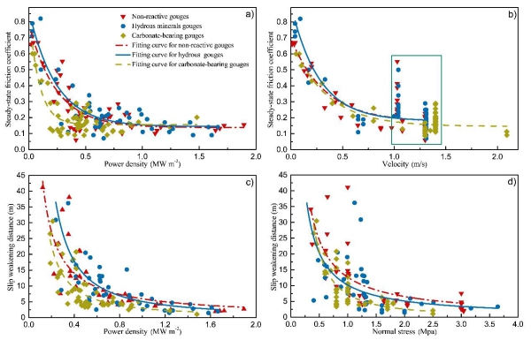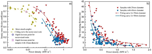 研究團(tuán)隊(duì)通過收集近280組巖石高速旋轉(zhuǎn)摩擦試驗(yàn)數(shù)據(jù),將試驗(yàn)巖樣分為高溫下穩(wěn)定礦物(包含石英,正長(zhǎng)石,斜長(zhǎng)石等)、高溫下發(fā)生脫水反應(yīng)礦物(包含高嶺石,蒙脫石,石膏等)和高溫下發(fā)生脫碳反應(yīng)礦物(石灰石,大理石等)三類。通過對(duì)試驗(yàn)數(shù)據(jù)進(jìn)行整理、擬合和分析(圖1)發(fā)現(xiàn),功率密度弱化模型相對(duì)于速度弱化模型和法向應(yīng)力弱化模型具有更好的趨勢(shì)和相關(guān)性。通過對(duì)比不同尺寸式樣(25mm直徑,40mm直徑,1m長(zhǎng)寬)的摩擦系數(shù)及弱化距離變化趨勢(shì),發(fā)現(xiàn)式樣尺寸越大,摩擦系數(shù)和弱化距離下降得越早,這種重要的尺寸效應(yīng)將為我們推廣實(shí)驗(yàn)尺度變化趨勢(shì)到自然滑坡尺度提供重要支撐。